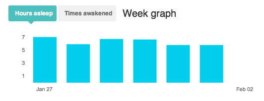 There’s a lot more data here, in what I think is a much more interesting and attractive visualization: Relative times to sleep and wake, plus display of two variants of nighttime activity, fully awake and partially awake or stirring. (The Fitbit nightly graph shows them as a single category of wakefulness). Unlike the built-in graphic, this one shows comparative times across days, which is particularly useful for figuring out just why I’m dragging my feet so much this morning – of course, it’s because I’ve been up by 5:30 at the latest all week while pushing my bedtime further and further from its sweet spot.