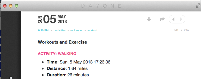 An annual exercise challenge rolled around again at my workplace, so naturally I found a project in it: Wondering if I could hook Runkeeper up to my Day One journal. The result: The Runkeeper plugin for Slogger